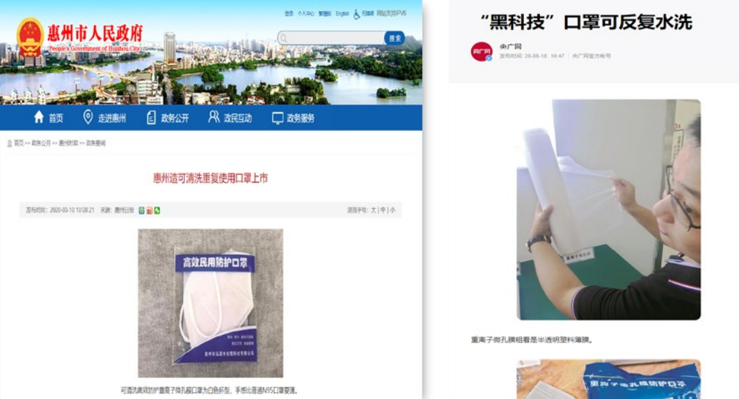 新冠疫情期间,口罩的核心过滤层材料熔喷布十分紧缺,是造成口罩供不应求的主要原因。为满足百姓对口罩的采购需求,为抗击新冠肺炎疫情贡献一份力量,我方采用重离子微孔膜作为过滤层替代传统熔喷布进行快速研发生产,短时间内成功开发产品并投入批量化生产,受到广大消费者的赞誉与新闻媒体的报道。