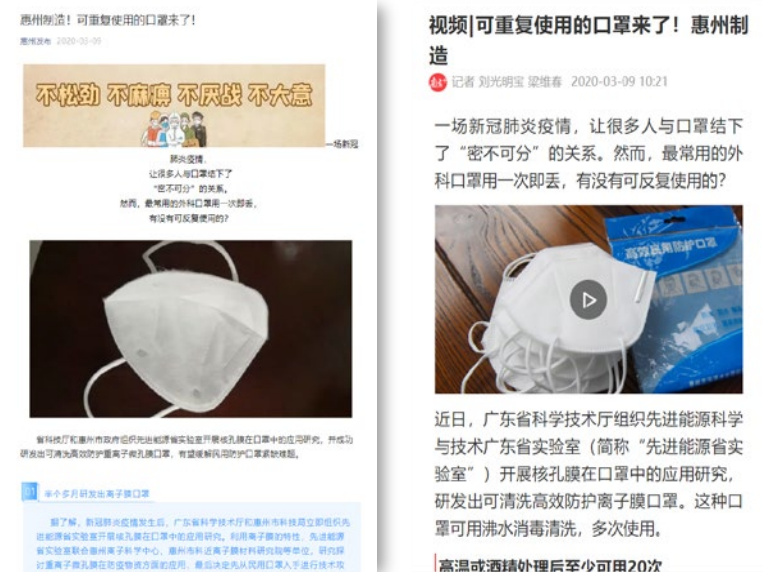 重离子微孔膜防护口罩是由先进能源科学与技术广东省实验室、惠州市科近离子膜材料研究院、惠州离子科学研究中心、惠州市泓源水处理科技有限公司联合研制,是广东省防控新型冠状病毒感染科技攻关应急专项研发的产品。